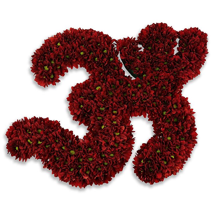 Crafted by our experienced florists, this Om/Aum flower tribute combines rich red tones with a crisp, defined shape, creating a powerful focal point for the service. Measuring approximately 60cm in length and 45cm in width, it is perfectly sized for display near the casket, altar or photo area.